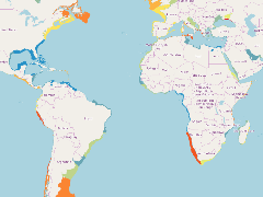In the above map Sensitivity of COSCATs to changes in nutrient loading according to COOLBEANS model. Red denotes high sensitivity, whereas blue represents low sensitivity. The primary purpose of the COOLBEANS model is to quantitatively link changes in bottom water oxygen concentrations to shifts in terrestrial nutrient loading and vertical exchange. COOLBEANS suggests that O2 conditions in these regions are likely to be sensitive to additional N inputs. In particular, the west coast of Central America and northern South America, the east coast of the South eastern Asian peninsula and the east coast of India are indicated as moderately to strongly sensitive to increasing nutrient inputs.